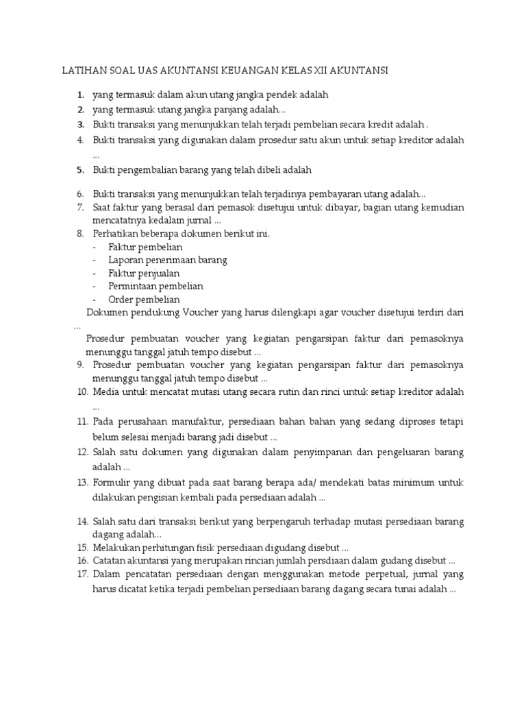 Dibawah ini yang termasuk ciri negara demokrasi adalah a. Soal otk keuangan kls xi ap. Tidak baik menolak kebahagiaan, kata arafat. Soal uas agama kristen ini juga bisa disebut pas (penilian akhir semester) 1. Jual komputer akuntansi perusahaan manufaktur dngn accurate smk kls 12 kikd dengan harga rp126.000 dari toko online pelangi books, jakarta timur. Adanya peradilan yang modern d. Tulis namamu di sudut kanan atas 2. Selain alat kesehatan dan keselamatan kerja hal yang tak kalah penting adalah sikap kerja, kecuali. Soal soal kimia 10full description. Penilaian akhir semester ganjiil pelajaran : Industri jasa keuangan memiliki beberapa profesi yang berperan dalam kemajuan industri antara lain: Dia terpaksa melayani penguasa yang mengagumi kecantikannya. Bahan dimasukan ke dalam baki ke dalam kereta yang bergerak e.