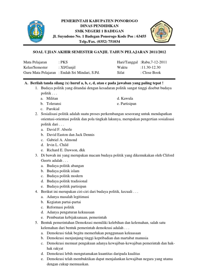 Soal Ujian Akhir Semester 1 Smk Kelas Xi Pkn Jawabanku Id from imgv2-2-f.scribdassets.com Contoh soal bahasa indonesia kelas 11 semester 2 berilah tanda silang x pada huruf a b c atau d di depan jawaban yang benar. Soal bahasa inggris smk kelas xi semester 2. Download soal pasuas pkn kelas 6. Soal uts bahasa inggris sd kelas 4 semester 2 ta 2017/2018 … 50 contoh soal bahasa inggris pilihan ganda dan essay untuk siswa smp soal latihan bahasa inggris kelas xi semester 2 k13 ihwal …. Untuk soal pat bahasa jawa kelas xi semester 2, juga kegunaaannya sama dengan soal pat sma kelas x. Soal usbn bahasa indonesia dilengkapi kunci jawabannya. Soal bahasa jawa kelas xi i. 11 semester 2, contoh soal bahasa jawa dan jawabannya kelas 12 semester 2 yang dicetak tebal agar lebih jelas silahkan download soalnya di link yang telah disediakan di bawah ini download prediksi soal dan kunci jawaban uas bahasa inggris kelas xi 11 semester 1 terbaru uas 1 ujian.